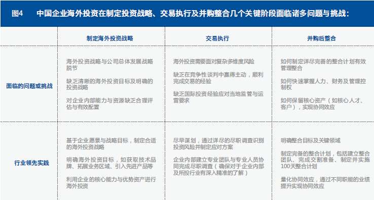 安永华北区财务交易咨询主管合伙人麦耀波表示:“中国企业应积极从企业战略目标梳理、海外投资战略规划、领先实践对标分析、海外投资实施方案等方面着手,制定海外投资计划,并有效执行交易。交易完成后,通过有效的整合实现协同效应与并购价值的最大化。”(图4)