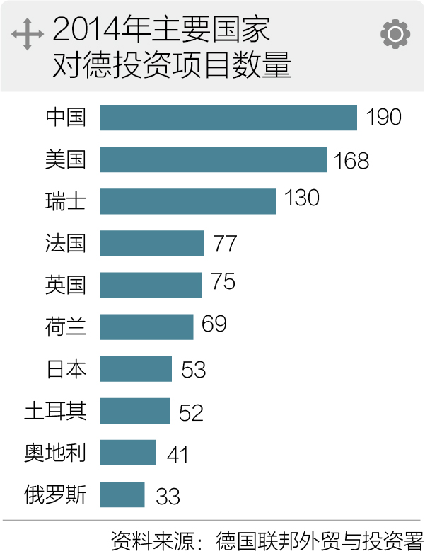 根据德国联邦外贸与投资署(GTAI)最新外国投资报告,2014年中国成为在德国项目投资数量最多的国家,总项目额度在190个。