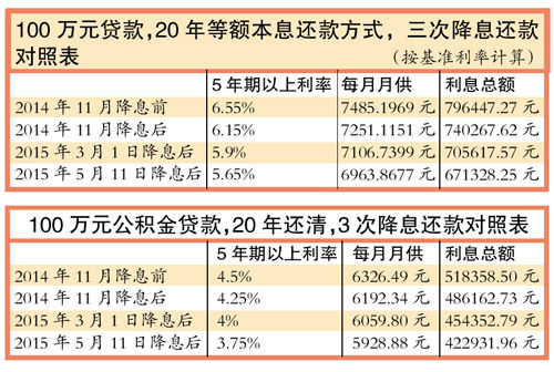 如果是公积金贷款,同样以100万元贷款额为例,三度降息之后,公积金支付利息就减少近10万元。