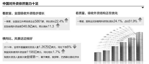 外商依然看好中国。上海美国商会日前发布的《2015年中国商业调查》显示,有73%和75%的受访企业2014年在华业务实现盈利或收入增长,有67%的受访企业计划2015年扩大在华投资。