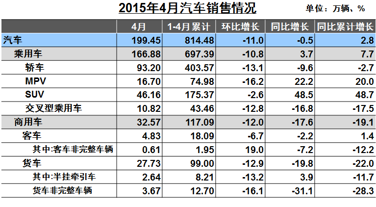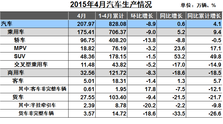 4月,汽车生产207.97万辆,环比下降8.93%,同比增长0.59%,比上年同期回落8.25个百分点;销售199.45万辆,环比下降10.98%,同比下降0.49%。其中轿车增速-2.7%,减少11.07万辆;MPV增速20%,增加12.51万辆;SUV增幅最高,增速48.7%,增加57.46万辆。