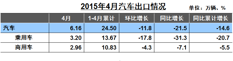 4月汽车企业出口为6.16万辆,比上月下降11.8%,本月降幅是今年以来的月度最大降幅。汽车工业协会副秘书长师建华提到,今年汽车出口情况不乐观。短期内影响出口情况的原因,一是由于出口国政治因素,二是人民币汇率升值,三是部分汽车企业调整出口结构。除此之外,我国出口大多是小排量汽车,出口市场接近饱和,品牌竞争力不强,出口国家税务政策等方面,也长期影响到我国汽车出口。