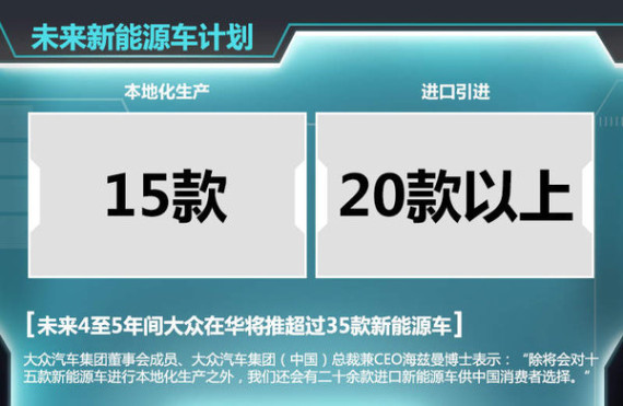 大众汽车集团曾官方公布将在未来4年内向中国引入20余款新能源汽车,并力争在2018年成为全球电动车市场的领导者。近日,大众汽车集团董事会成员、大众汽车集团(中国)总裁兼CEO海兹曼博士向媒体表示:“在今后的四至五年间,我们将会实现十五款新能源车的本地化生产,除此之外还会有二十余款进口的新能源车型供中国消费者选择。”也就是说,未来的4到5年里,大众品牌在华将推出超过35款新能源车型。根据海兹曼博士的预期,未来大众旗下新能源车型的在华销量将大幅提升。