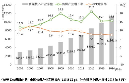 根据清华大学传媒经济与管理研究中心的统计测算,2014年全年传媒产业总值达11361.8亿元,首次超过万亿元大关,较上年同比增长15.8%。