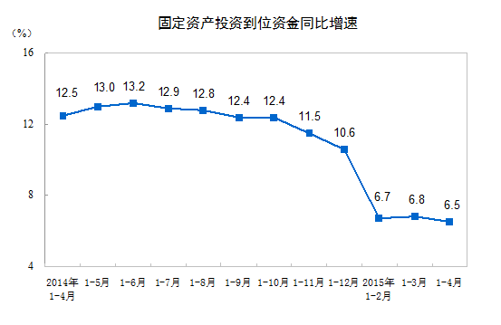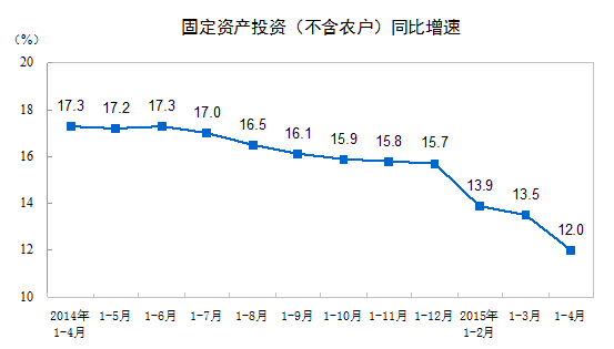 2015 年 1-4 月份,全国固定资产投资(不含农户) 119979 亿元,同比名义增长 12.0% ,增速比 1-3 月份回落 1.5 个百分点。从环比速度看, 4 月份固定资产投资(不含农户)增长 0.89% 。