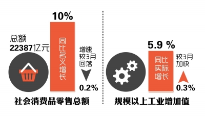 数据同时显示,4月工业生产增长有所加快,4月份,规模以上工业增加值同比实际增长5.9%,比3月份加快0.3个百分点。