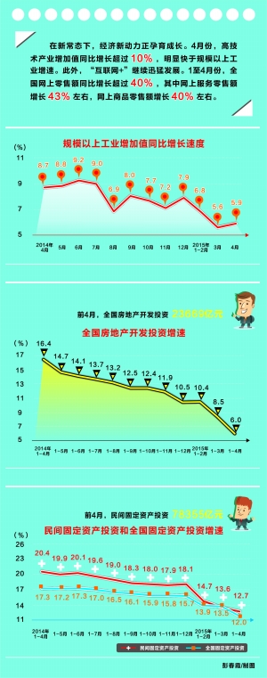 “在4月份国民经济运行处在合理区间的同时,推动经济平稳增长的积极因素继续显现,并不断积累。”国家统计局新闻发言人盛来运指出,一些指标增速仍在回落,工业生产者出厂价格(PPI)和进口持续下降,不同地区、行业、市场主体分化态势明显,保持经济平稳增长仍需付出艰辛努力。