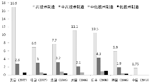在所有产业中,(1)高技术(high tech):主要发达国家的高技术制造业的研发强度最高,2007年美国达到16.9%,日本在2008年为10.5%,相对比2013年我国为1.75%;(2)中等技术(medium tech):美国研发强度最高,达到7.5%;英国为5.1%,日本为5.9%;(3)低技术(low tech):这几个国家的中低或低技术制造业的研发强度都很低,基本都是低于1%。
