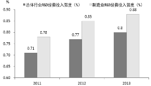 相比之下,中国高技术企业研发强度仍显滞后。《科技经费统计公报》显示,2013年中国规模以上高技术制造业企业R&D经费支出2034.3亿元,占规模以上制造业的比重为25.6%;R&D经费投入强度为1.75%,比规模以上制造业平均水平高0.87个百分点。其中航空、航天器及设备制造业的研发强度最高为6.12%。具体深入到细分行业这种差距更为显著。