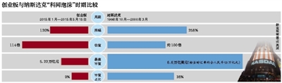 与此同时,A股创业板的业绩增长却无法和纳斯达克指数同日而语。公开数据显示,2014年创业板446家上市公司利润总和同比增长16.67%。2015年一季度创业板公司的利润同比增速下降至10%。这远远低于当年纳斯达克泡沫时的水平,甚至还远低于纳斯达克上市企业现在的利润增速。