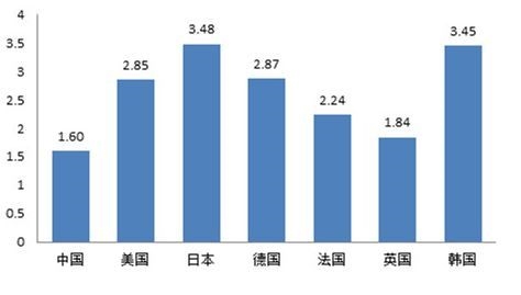 图1 2012年各国制造业研发投入强度对比图(单位:%)