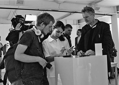 俄罗斯优特设备公司不久前在莫斯科举行第二代优特手机白色款发布会。图为工作人员向参会者介绍手机新功能。