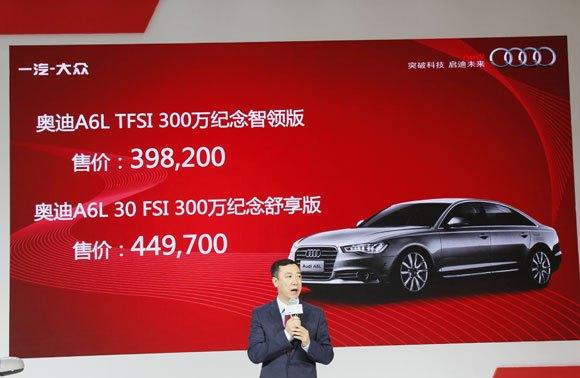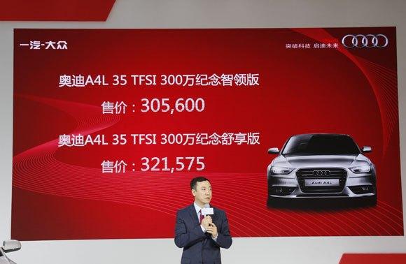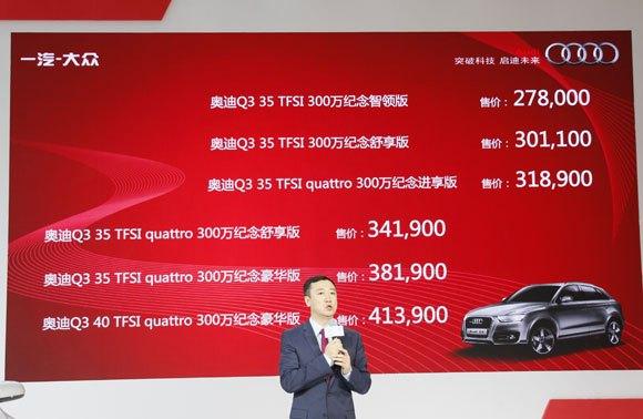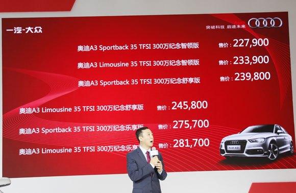 中国经济网北京5月22日讯(记者 杨昕艳)5月21日,一汽-大众奥迪迎来第300万名用户。奥迪携手全国经销商伙伴,全网启动“礼赞300万车主信赖”感恩活动,4款“300万辆纪念版”车型也正式上市,分别为A3、A4L、A6L以及Q3,A3纪念版售22.79-28.17万元、A4L纪念版售30.56-32.1575万元、A6L纪念版售39.82-44.97万元、Q3纪念版售27.80-41.39万元。