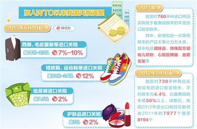 在本次调整中,西装、毛皮服装等的进口关税将由14%—23%降低到7%—10%,短统靴、运动鞋等的进口关税由22%—24%降到12%,纸尿裤的进口关税由7.5%降低到2%,护肤品的进口关税由5%降低到2%。