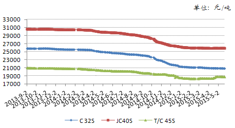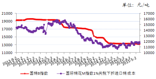 近两年国内外皮棉价格振荡下跌,内外棉价差也在不断缩小。截至2015年5月20日,国内外皮棉价差在1500元/吨上下,较2013年9月下降3000元/吨。内外棉价差不断缩小,而纺企也在不断转型升级,中高端纱竞争优势明显高于东南亚地区,2015年纺织企业普遍反映订单情况好转,经营略有薄利。