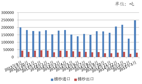 另据数据显示,我国进口棉纱数量远高于出口量,目前东南亚地区棉纱加工成本远低于国内水平,进口低支纱价格优势明显,不断冲击国内市场。2015年3月,国内进口棉纱24.86万吨,同比上升39.6%;2014年9月-2015年3月,国内累计进口棉纱130.79万吨,同比上升5.09%。