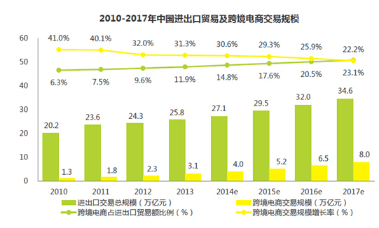据中国电子商务研究中心监测数据显示,2014年中国跨境电商交易规模为4万亿元人民币,同比增长30.6%。2013年我国跨境电商交易规模为3.1万亿元,增长率为31.3%,占进出口贸易总额的11.9%,随着国家跨境电商利好政策的先后出台、行业参与者的积极推动及行业产业链的逐渐完善,预计未来几年跨境电商将继续保持平稳快速发展,预计在2017年跨境电商在进出口贸易总额中的渗透率将达到20%左右。
