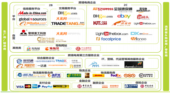 从2014年中国跨境电商的交易模式看,目前跨境电商B2B交易占比达到92.4%,跨境电商B2B交易占据绝对优势。由于B2B交易量级较大、且订单较为稳定,所以未来跨境电商交易中B2B交易仍然是主流,但随着跨境贸易主体越来越小,跨境交易订单趋向于碎片化和小额化,所以未来B2C交易占比也会出现一定的提升,预计2017年中国跨境电商中B2C交易占比将达到10%左右。