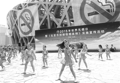 5月31日,2015年世界无烟日暨《北京市控制吸烟条例》实施宣传活动在北京鸟巢举行。图为当日活动现场,“鸟巢”外墙悬挂的巨幅禁烟标志。本报记者吴佳佳摄