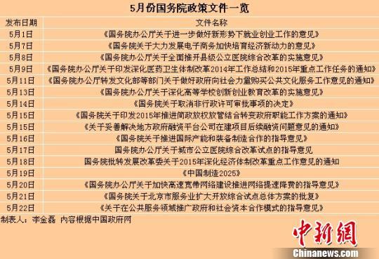 中新网北京6月1日电(记者 李金磊)刚刚过去的5月份,国务院先后出台了十余份重磅文件。从推进简政放权、部署医改,到发布《中国制造2025》,再到促进大众创业、万众创新,督促网络“提速降费”……一系列动作凸显出“促改革、调结构、惠民生”这三大关键词。