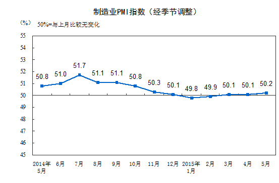 2015年5月份,中国制造业采购经理指数(PMI)为50.2%,比上月微升0.1个百分点,高于临界点,制造业小幅扩张。