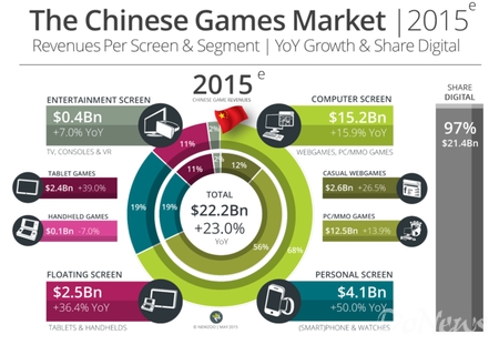 荷兰市场研究机构Newzoo公布了《2015年全球游戏市场报告》的几项最新关键数据。报告指出,2018年美国游戏市场将收入241亿美元,而中国游戏市场的收入将超过美国87亿美元,增长至328亿美元(约1800亿元人民币)。