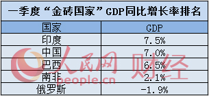 “金砖国家”中,一季度GDP同比增长率最高的为印度7.5%,中国增长7.0%排第二位, 巴西增长6.5%,南非增长2.1%,俄罗斯则下降了1.9%。