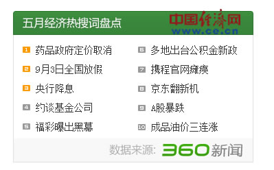 “月度经济热词”由中国经济网与360新闻联合推出,按网络搜索频率排出,是对过去一个月经济热点的回顾。