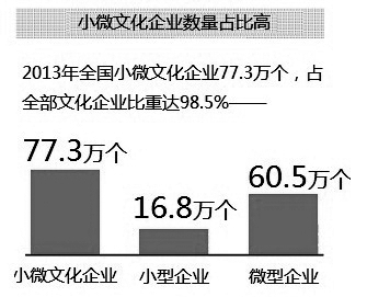 数据:4月27日,国家统计局首次发布了小微文化企业有关统计数据。2013年末,全国共有小微文化企业77.3万个,占全部文化企业的98.5%,小微文化企业共有从业人员979.9万人,占全部文化企业的63.3%。小微文化企业已成为我国文化产业不可或缺的组成部分。