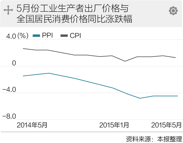 昨日,国家统计局公布数据显示,5月CPI(居民消费价格指数)增速从上个月的1.5%显著下降至1.2%,回落幅度大于市场预期。此外,5月PPI(工业生产者价格指数)同比增速没有改善,和上个月持平在-4.6%,但环比增速降幅比上月收窄0.2个百分点至-0.1%。