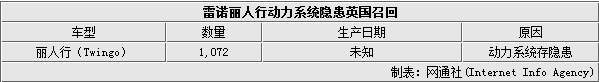 由于动力系统存在隐患,雷诺汽车公司在英国对丽人行(Twingo)车型启动召回,涉及1,072辆。