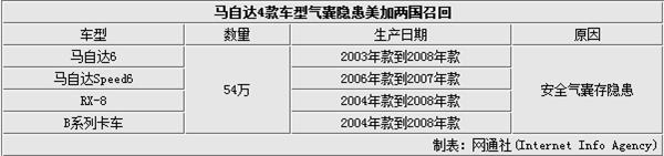 由于装配了有缺陷的高田气囊,日本马自达汽车将在美国和加拿大市场召回近54万辆旧型号的轿车和皮卡,本次召回车型为2003年款到2008年款的马自达6,2006年款到2007年款的MazdaSpeed 6,以及2004年款到2008年款的RX-8,公司还将召回部分2004年款到2008年款的B系列皮卡,共涉及54万辆。