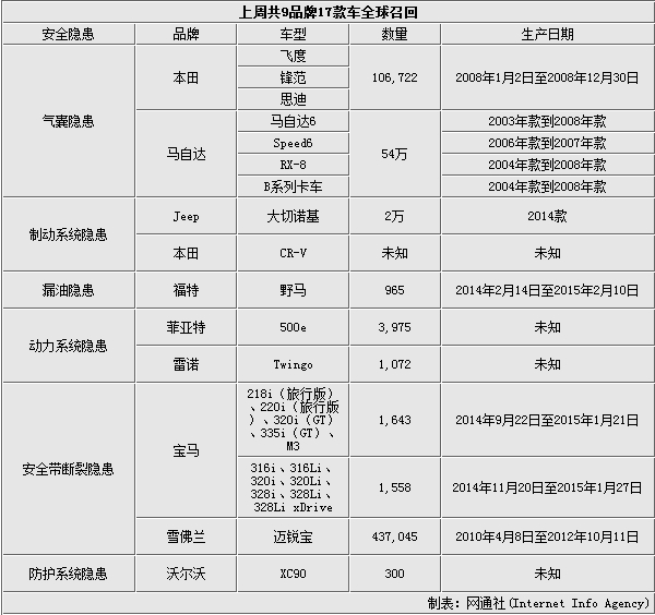 汽车作为人类社会目前最方便、最普及的代步工具,所创造的价值不仅是将人从一个地点带到另一个地点,更是人类社会向前迈进的一步又一步。中国汽车行业发展的几十年更像是这一深层价值的缩影,从有车到好车,从小车到豪车,人们在追寻更快更舒适的同时,对汽车安全性的意识也随之增强。由于汽车是集合性特质,一辆完整的车由多个系统组合而成,包括安全防护系统、ECU电子系统、动力系统、悬挂系统等,牵一发动全身,当一个系统中的某一环节出现问题,影响的可能是整车的安全。接下来跟随网通社看一看一周的全球汽车召回情况。