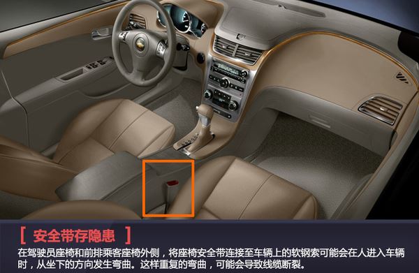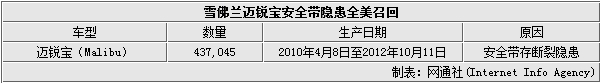 由于安全带固定钢索存断裂隐患,通用汽车有限公司在全美召回部分2012款雪佛兰迈锐宝(Malibu),生产日期 2010年4月8日至2012年10月11日,涉及437,045辆。