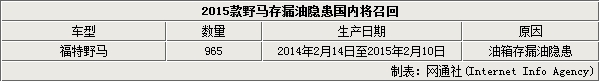 由于油箱存漏油隐患,福特汽车(中国)有限公司将在国内召回部分进口2015款2.3L福特野马车型,生产日期为2014年2月14日至2015年2月10日,共涉及965辆。