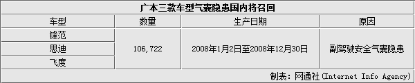 由于副驾驶气囊隐患,广汽本田汽车有限公司实施的部分飞度及思迪轿车召回活动的车辆范围扩大,补充召回2008、2009款飞度、思迪、锋范车型,共涉及106,722辆。
