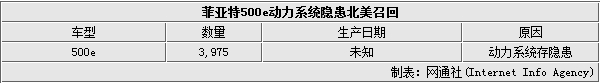 由于动力系统存在隐患,菲亚特克莱斯勒汽车公司(FCA)在北美地区对菲亚特500e车型进行召回,涉及3,975辆。