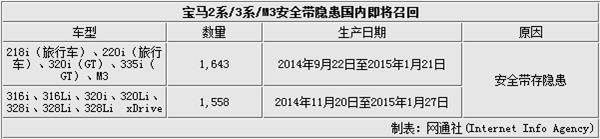 由于部分车辆前排右侧安全带存无法拉出的安全隐患,宝马(中国)汽车贸易有限公司将在国内扩大召回,召回车型为宝马中国旗下进口的2014年9月22日至2015年1月21日生产的部分宝马218i(旅行车)、220i(旅行车)、320i(GT)、335i(GT)、M3汽车,共计1643辆;华晨宝马旗下2014年11月20日至2015年1月27日生产的部分宝马316i、316Li、320i、320Li、328i、328Li、328Li xDrive汽车,共计1558辆,总计3,201辆。