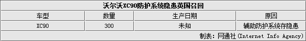 由于前排座椅侧碰撞保护系统安全气囊(SIPS)线束装配缺陷,沃尔沃汽车公司在英国召回XC90车型,涉及300辆。