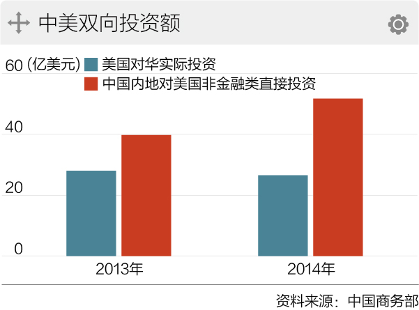 中国商务部公布的统计数据显示,2014年,中国内地对美国非金融类直接投资52亿美元,同比增长27%。截至2014年底,中国企业在美各类投资累计超过385亿美元,美已成为中国对外直接投资的第三大目的地。