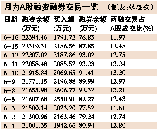 在各种监管指引下,目前股市杠杆资金增速已经明显放缓。截至6月16日,沪深两市的融资余额为2.39万亿元,再度创下历史新高,不过,环比增长0.34%,为最近5个交易日最低值。场内的杠杆交易比例也持续走低,融资融券交易占当日A股成交量比已由今年2月10日22.26%的高峰降到最新的11.97%,降幅达46.23%。而同期沪指上涨了57.91%。