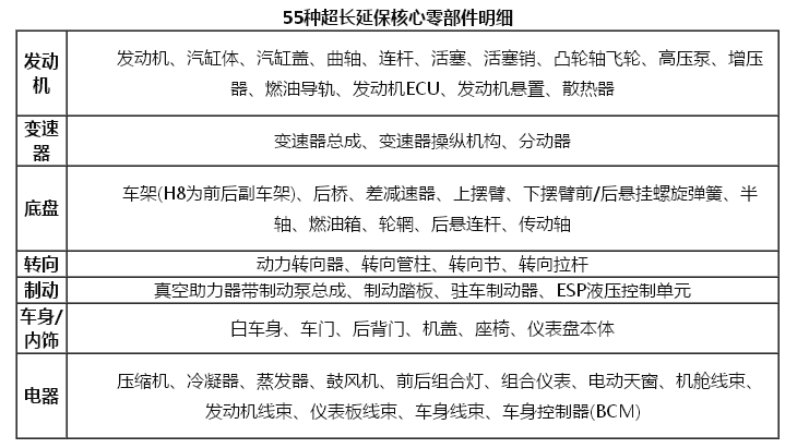 哈弗H8、哈弗H9车型55种延保核心零配件明细