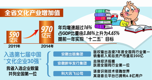 “‘文化产业强’是我省文化‘八个强’建设的重要内容。如何撬动‘文化产业强’?如何实现丰厚历史文化资源的创造性转化、创新性发展?我省的实践是,打造全国一流的文化园区和文化企业品牌,把‘无形’的文化资源落实在‘有形’的产业项目上,助推产业转型升级,持续壮大文化力量。 ”省委宣传部副部长、省文化发展改革办公室主任董庆介绍说,全省文化产业增加值由2011年的590亿元增加到2014年的970亿元,年均增速超过16%,占GDP比重由3.86%上升为4.65%,提前一年实现“十二五”目标。