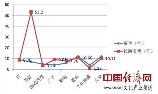 据中国经济网文化产业频道记者不完全统计,截止2015年6月20日,2015年上半年文化产业市场投融资及并购事件共有83起,除去未披露资金的27起,涉及金额约244.24亿元。主要涉及IT、旅游、广告、游戏动漫、文化传播、影视、传媒、教育等8个行业,其中传媒、教育及旅游是热点领域。其中投融资事件59起,涉及金额约93.94亿元,并购事件24起,涉及金额约140.30亿元。