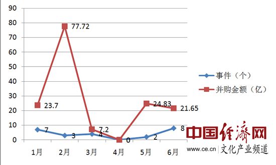 通过数据显示,2015年上半年投资市场热度高于并购市场,企业更多通过融资而非重组获得资本。在投资市场中,1月投资热度达到顶峰,3月投资金额最高,数据图呈现大幅度波动,2月和4月达到波谷,6月份市场有复苏迹象,预计下半年融资市场将有所提升;在并购市场中,总的来说2015年上半年文化产业“爆冷门”,2月作为上半年并购金额的制高点,并购热度并不佳,仅有3家公司进行了重组并购。其它月份规模都比较小,甚至四月出现了“冰点”,未发生并购事件。总的来说,2015年,文化产业投融资、并购市场相较2014年都有所降温,无论是创投市场还是并购市场都有所“收敛”,相对过去的泡沫经济,资本回归理性。