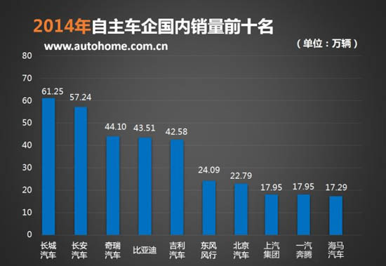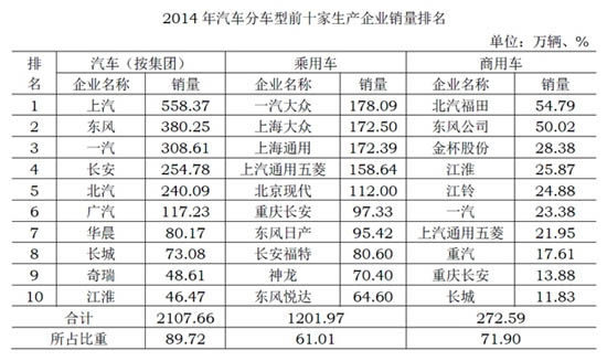 据中汽协数据,2014年我国销售汽车2349.19万辆。销量排名前十位的企业集团销量合计为2107.7万辆,占汽车销售总量的89.72%。销量排名前十位的自主品牌车企销量合计348.75万辆,占销售总量的15%。