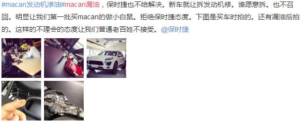 然而,车卖得好,问题也随之而来。如上市后不久,发动机漏机油的问题一直困扰着Macan。不少网友晒出了Macan漏油的情况,更有网友指出2.0T款全部漏油。甚至有网友评论说:“不光在价格上给保时捷降了价,连质量也拉低了保时捷。”