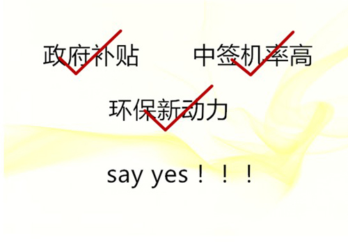 摇号方面:新能源汽车单独设立摇号池,虽然第三期参加摇号数增至7141个,放号量3000个,但是中签率还是远远大于普通的燃油汽车呢!粗粗一算,汽车的摇号中签率为0.66%,新能源汽车的摇号中签率为42%。并且,每年的新能源小客车放号实施增量限制,2014年分配指标2万个,2015年分配指标3万个,2016、2017年分配6万辆。是否让你看到了中签的曙光呢?
