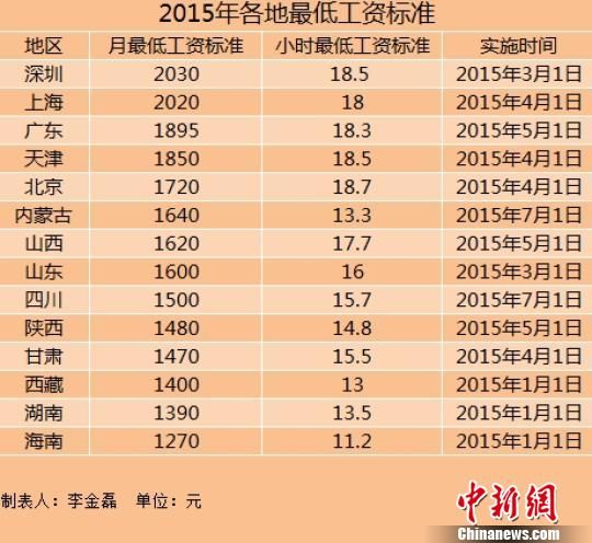 中新网北京7月3日电 (记者 李金磊) 进入7月份,四川、内蒙古均上调了最低工资标准。据中新网记者不完全统计,截至目前,全国至少已有14个地区上调了2015年最低工资标准。其中,上海、深圳两地最低工资水平超过2千元大关。
