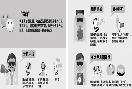 目前在微博、微信等社交媒体上出现的商品广告越来越多,这种基于社交媒体的新型电商被称为微商,主要分为C2C(个人对个人)微商和B2C(商家对个人)微商两大类。微信月活跃用户数超过5亿,每人日均启动次数超过10次。由于在用户数、流量、社交黏性等方面占据优势,微信成了微商们的主要阵地。